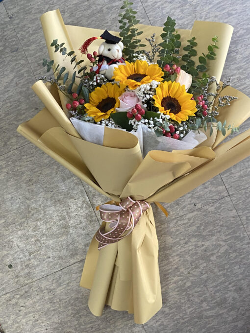 Sunflowers and roses bouquet with graduation bear